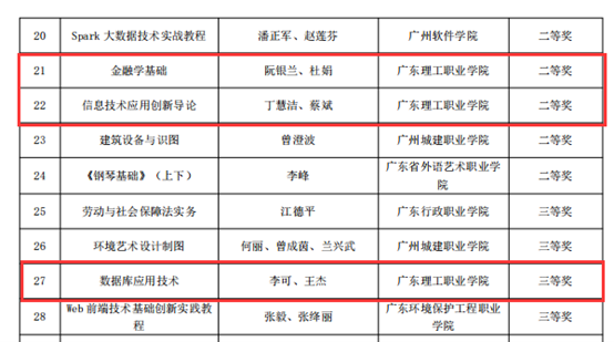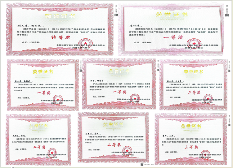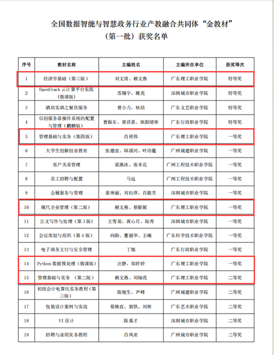 近日,全国数据智能与智慧政务行业产教融合共同体2025年度职业教育“金教材”评选结果揭晓,广东理工职业学院选送的8部教材全部获奖,其中《经济学基础(第三版)》(刘文清、赖文燕主编)荣获特等奖、《管理基础与实务(第四版)》等3部教材获一等奖、3部教材获二等奖、1部教材获三等奖,创下全国同类院校单次申报获奖数量与等次双高纪录,充分彰显我校在职业教育教材建设领域的创新实力。